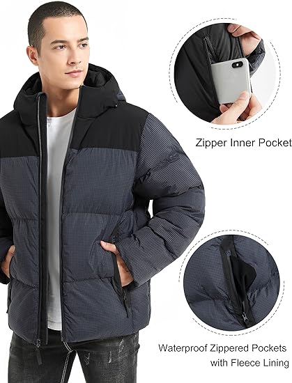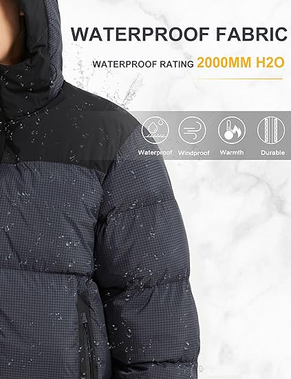 Waterproof Protection: Our mens puffer jacket outer shell is made from a special 50d cotton-like fabric, enhanced with a thick TPU transparent membrane. The puffer coat surface of the fabric is treated with a 2000mm waterproof rating to protect against rain, snow, fog and sewage, keeping your body dry.